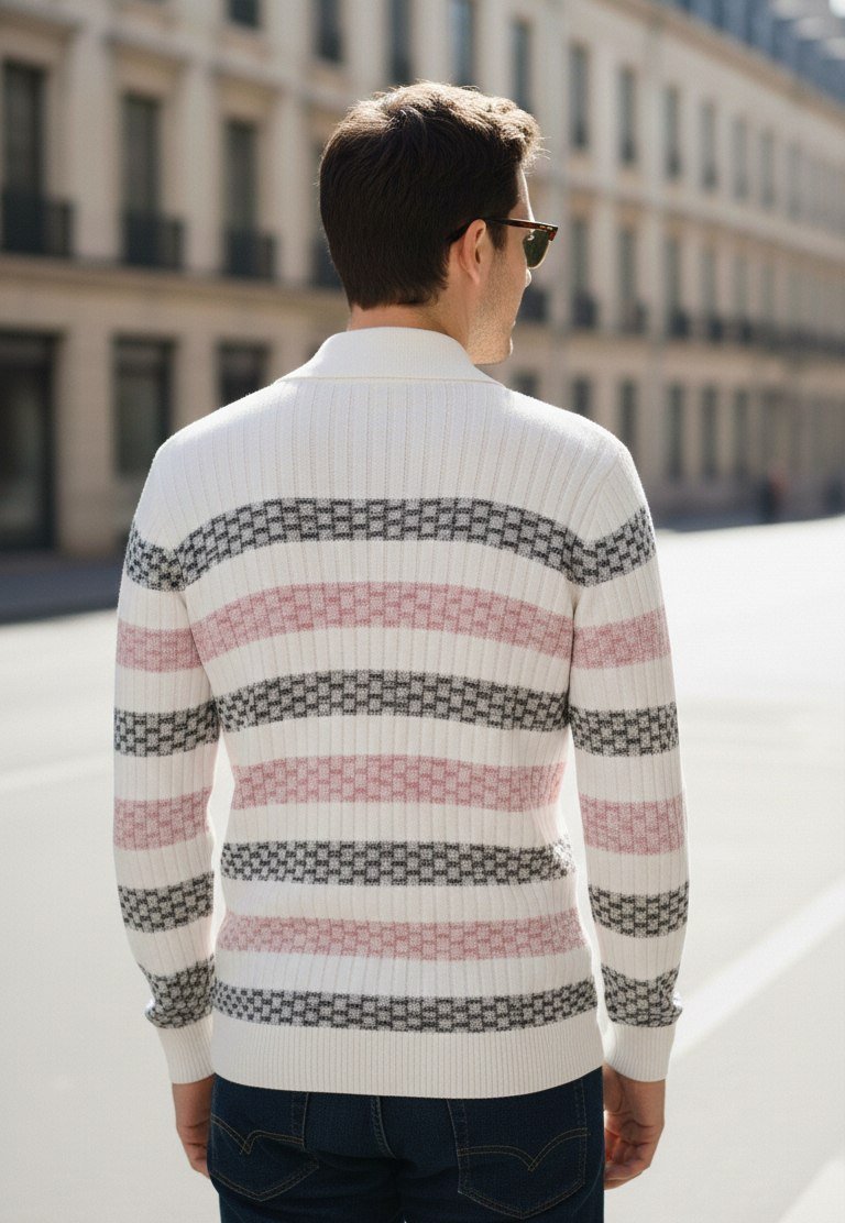 The Aurora Woven Texture Half-Zip Sweater combines cozy comfort with timeless style. Crafted with a soft ribbed knit, this sweater features an elegant off-white base accented by intricate basket-weave patterns in subtle grey and pink. The classic collar and smooth half-zip closure add a refined, modern edge, making it perfect for both casual and semi-formal wear.