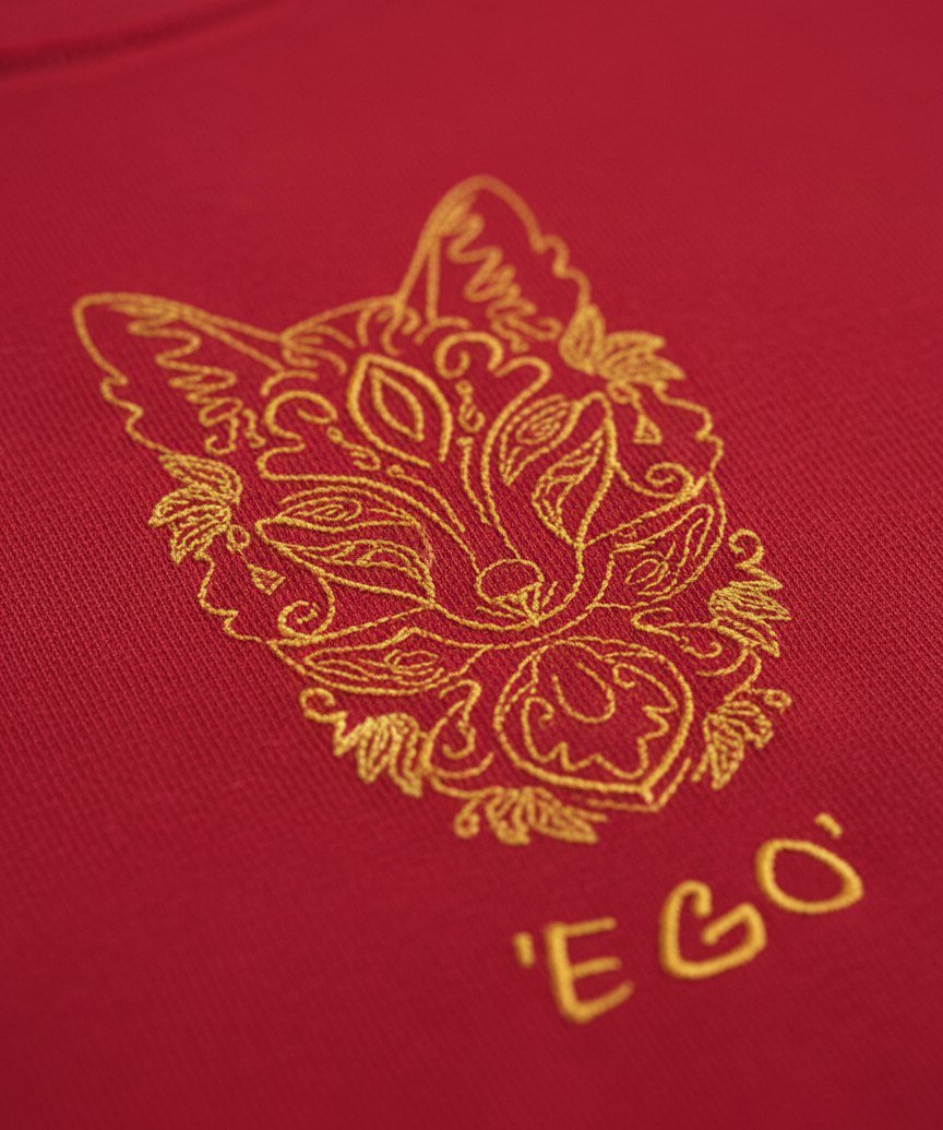 Design: Golden thread embroidered Fox Art + “EGO” text